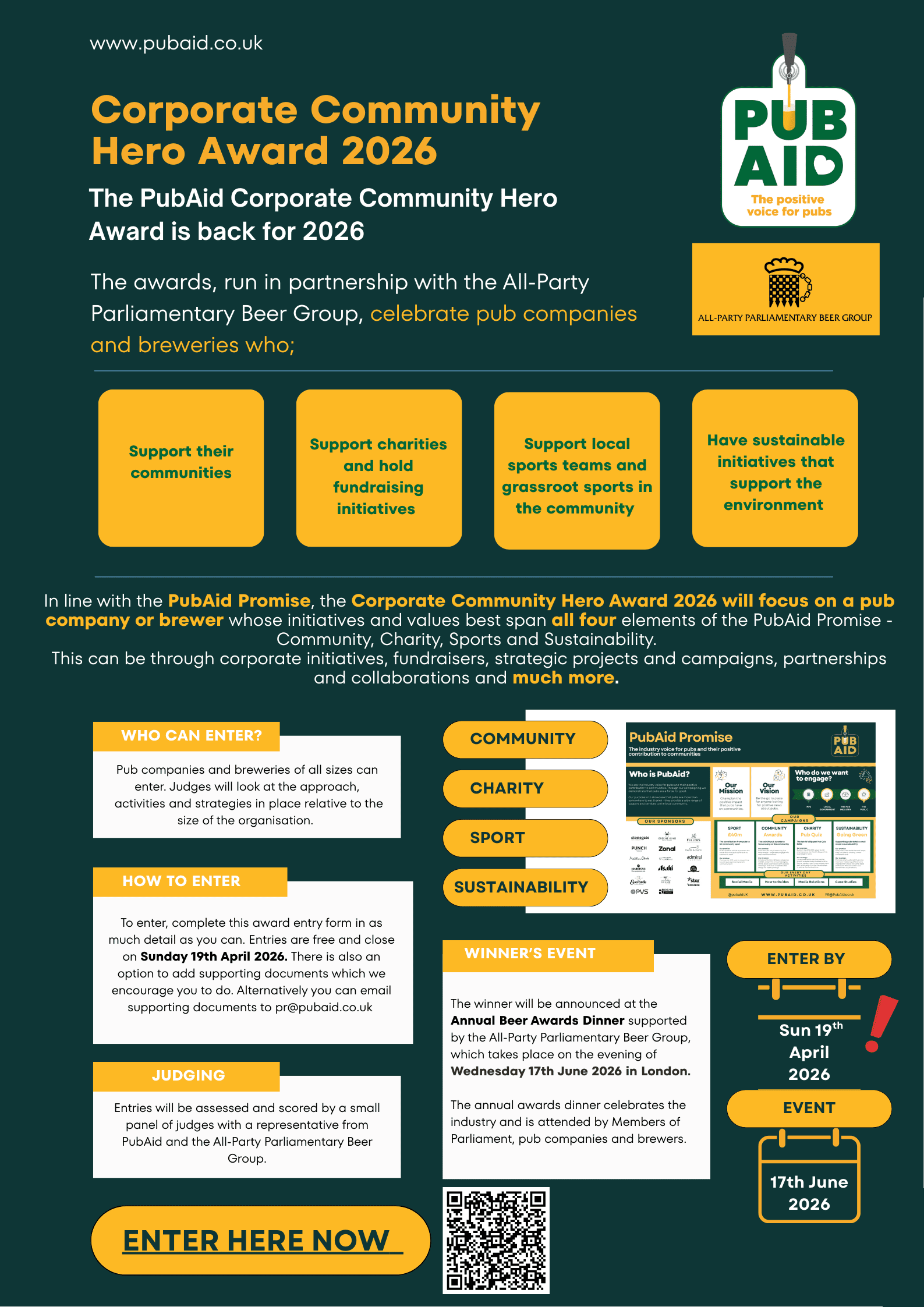 In line with the PubAid Promise incorporated in 2024, the Corporate Community Hero Award 2025 will focus on a pub company or brewer whose initiatives and values best span all four elements of the PubAid Promise - Community, Charity, Sports and Sustainability.